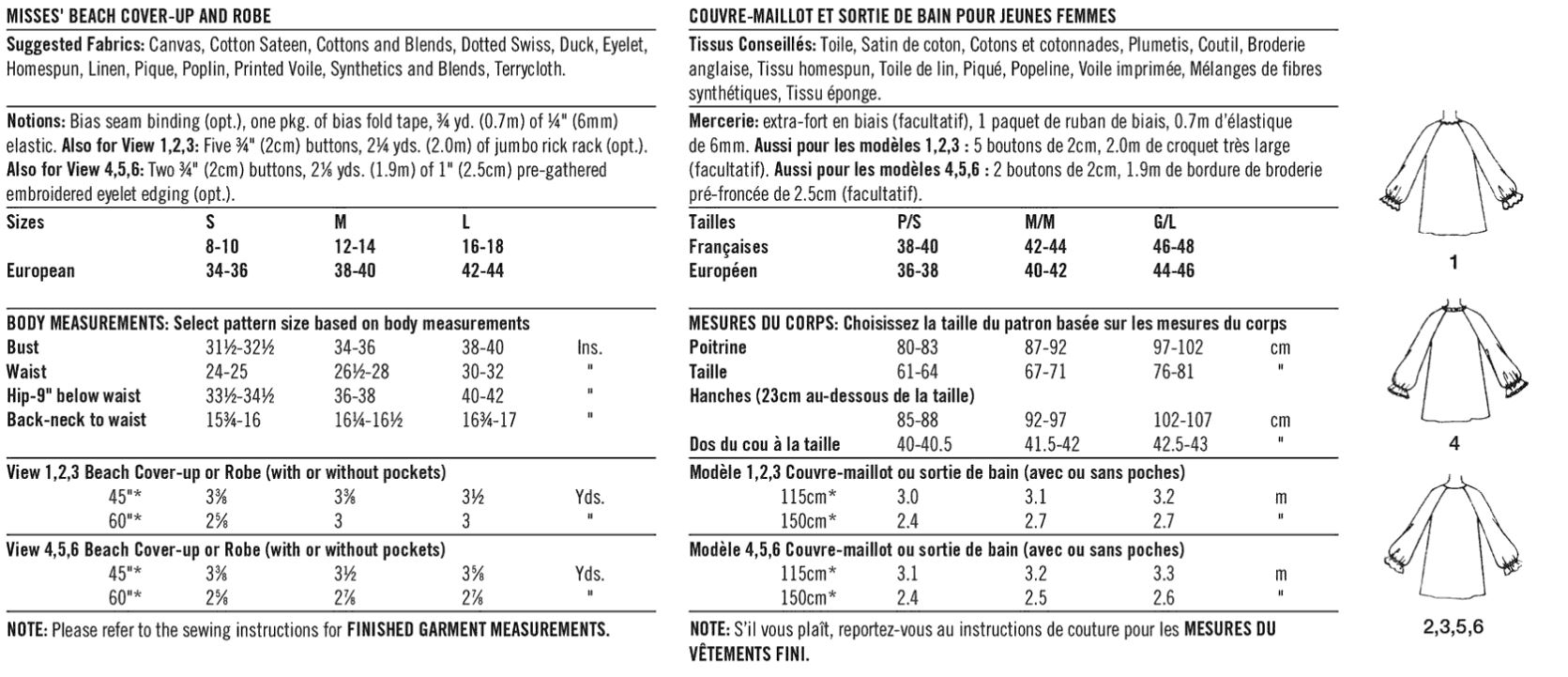 Vintage Simplicity 1960's beach cover-up and robe sewing pattern. The collarless, above knee-length beach cover-up or robe has slightly lowered round neckline, long raglan sleeves gathered with elastic casings forming self-ruffles and optional patch pockets. View 1, 2 and 3 with front button closing have optional rick-rack trim. View 4, 5 and 6 with optional embroidered eyelet edging trim has front gathered to yoke with button closing. Authentic Vintage Reproduction.
