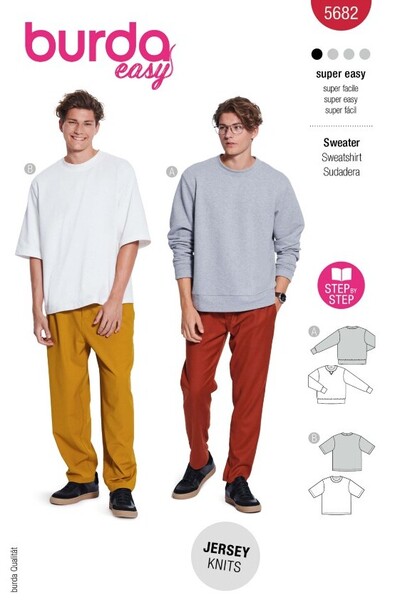 This pattern for our men’s sweatshirt and t-shirt is perfect for beginners. The classic sweatshirt with cuffs is a timeless staple, easy and quick to sew—ideal for a last-minute gift! The t-shirt features a trendy cut with dropped sleeves and drapes beautifully when made with sturdy jersey fabrics. Both styles are simple to make and perfect for creating stylish, comfortable pieces.