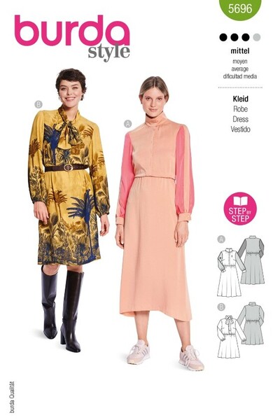 This dress pattern offers two chic variations – perfect for experienced sewers! The first pattern blends sporty and feminine elements with a stand-up collar, concealed button placket, and bell skirt, highlighted by colorful stripes and color blocking. The second pattern is versatile, featuring a flap and elasticated waist, making it ideal for dinner, the office, or a party. Dress it up with a blazer and heels, or keep it casual with ballerinas!