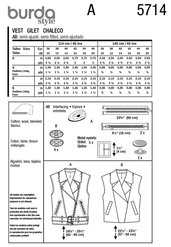 This vest pattern, ideal for advanced hobby sewers, offers two versatile variations. The first features a biker-inspired design with an asymmetrical closure, zipper pockets, and a belt—perfect for a rock look that’s also office-ready. The second combines sporty elegance with impeccable shaping and fine coat details like welt pockets and diagonal woolen fabric—truly eye-catching!