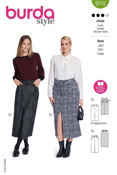 This skirt pattern, perfect for experienced sewers, offers two stylish versions. The first combines a rock jeans vibe with elegant details: star-adorned pockets, an extra-long belt with eyelets, and a figure-hugging cut with a slit. The second merges denim and kilt styles, featuring a slim midi skirt with a slit and fringes that beautifully flatter the figure.
