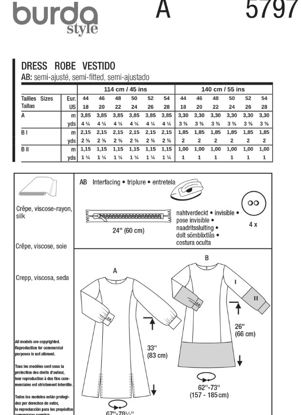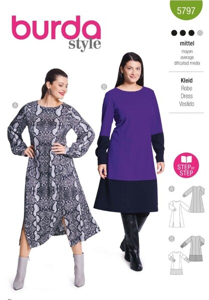 Discover this curvy women’s dress pattern that comes in two versions! The A-line dress with sophisticated princess seams and swinging dividing seams offers freedom of movement and flatters the figure. The dress pattern with cuffs combines sportiness with an elegant touch thanks to colour blocking and precise cuffs. Perfect for crepe, viscose or silk. Style yourself smart and comfortable at the same time!