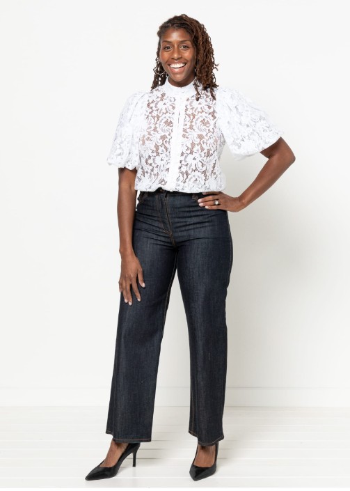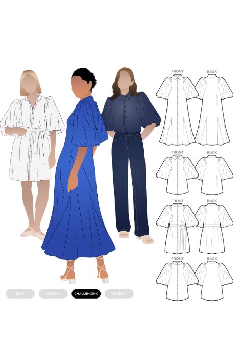 The Dallas Woven Shirt and Dress sewing pattern creates a puff sleeved button front shirt or dress, with optional godets for the dress. It features high or traditional two-piece collar options, a front placket with buttons and loops, elbow-length puff sleeves gathered into a lined elastic cuff, waist tie with belt loops and optional inseam pockets and dress godets.