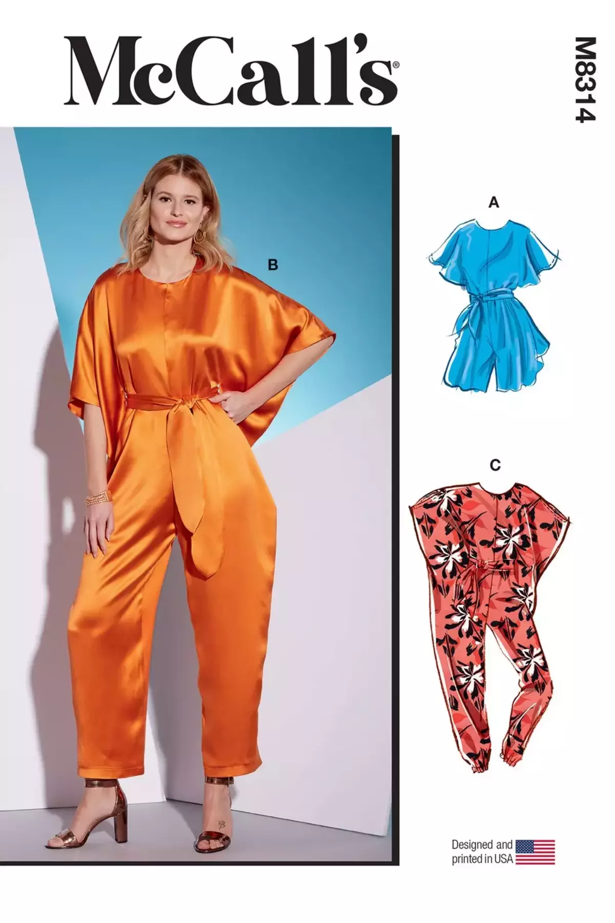 Caftan-style romper and jumpsuits with sash have front opening with hook and eyes. Views B and C have opening for sash to pull through. View C has arm opening at shoulder line for a cowl drapey look and has elasticized hems.