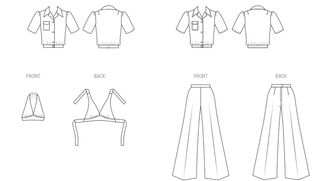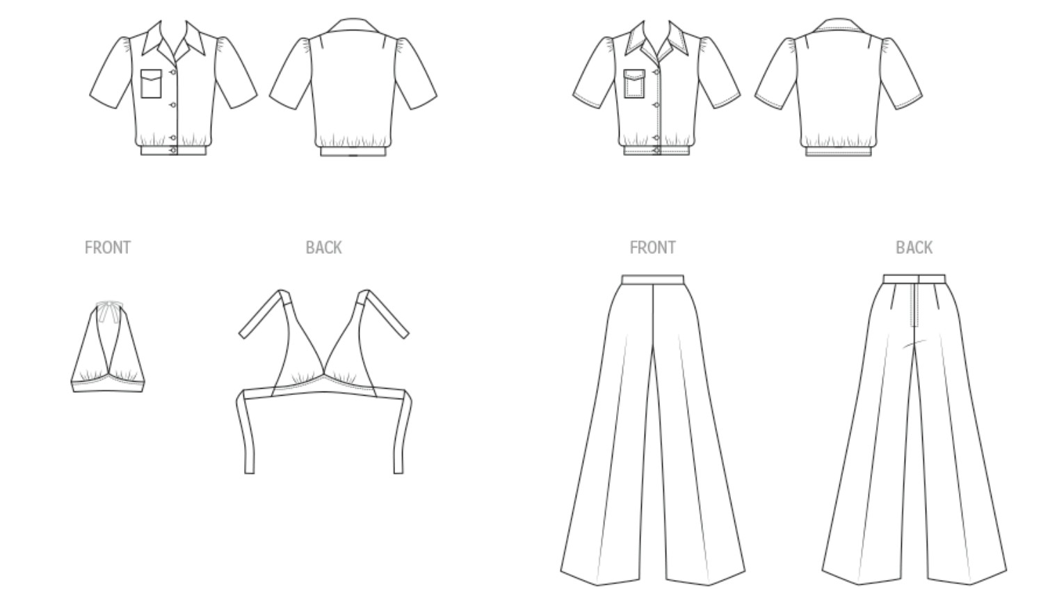 Blouse, Halter and Pants in Challis, Chino, Cotton Blends, Lightweight Cotton, Polyester Satin, Satin Back Crepe, Synthetic Crepe, Synthetic Gabardine, Synthetic Jersey. Interfacing: Lightweight Fusible.
