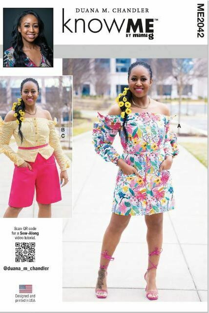 Off the shoulder button down dress and top have ruching and ruffles running down the sleeves, oval opening at back and skinny ties at the side seams that wrap from front to back. Trouser shorts have front welt pockets, front and back waist darts and side seam zipper.