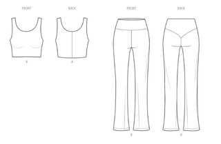 Sleeveless sports top pattern is cropped and has scoop neckline. High waist leggings have wide waistband and flare hem.