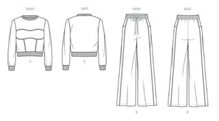 Sweatsuit top sewing pattern designed in a corseted silhouette has long sleeves, rib knit neckline, hem and cuffs. Wide leg knit pants have elastic waistband with drawstring, and side pockets. Top and pants have purchased piping or trim.