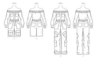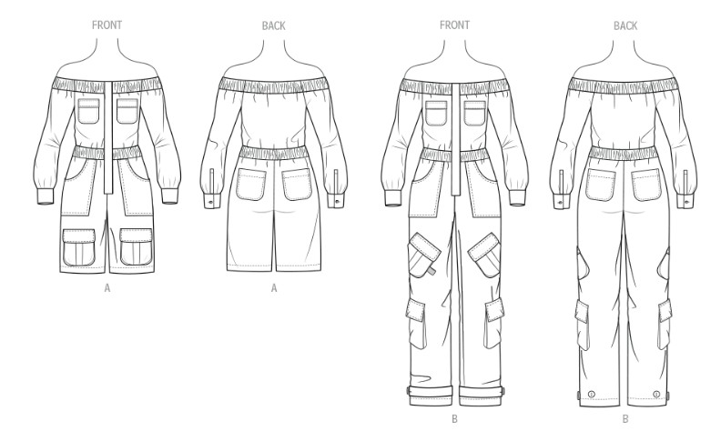 Off the shoulder jumpsuit sewing pattern has placket with hidden buttons, elastic waist casing, long sleeves with button cuffs and length and pocket variations. View B jumpsuit has button tabs on the legs.