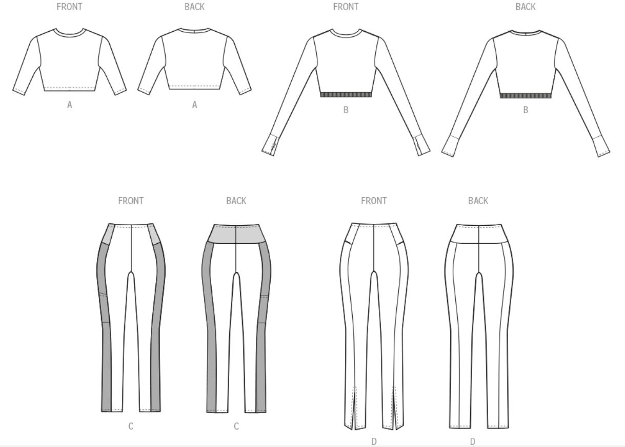 Cropped knit top with short or long sleeves and leggings in two lengths with seaming details and optional color blocking. View D leggings have front leg slits.