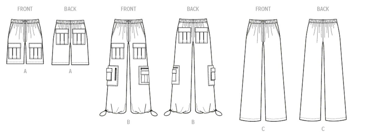 Misses' and Men's wide leg cargo pants and shorts have elastic and drawstring waist and pocket variations. View B has an elastic cord at hem.
