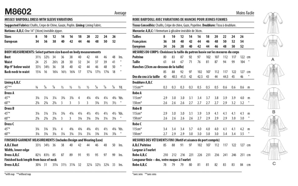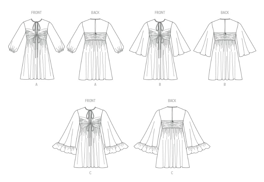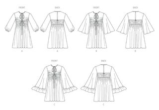 Babydoll dress pattern, close-fitting through bust, loose at waist and hips, has front ties, gathered bodice overlay and invisible back zipper. View A has 3/4 sleeves. Views B and C have angel sleeves.