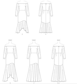 Close-fitting, off-the-shoulder trumpet dress pattern has underlined bodice, invisible back zipper, long sleeves and length variations.