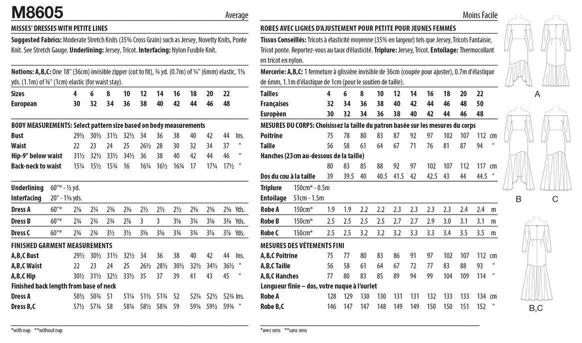 Fabric Suggestions: Moderate Stretch Knits (35% Cross Grain) such as Jersey, Novelty Knits, Ponte Knit. See Stretch Gauge. Underlining: Jersey, Tricot. Interfacing: Nylon Fusible Knit.