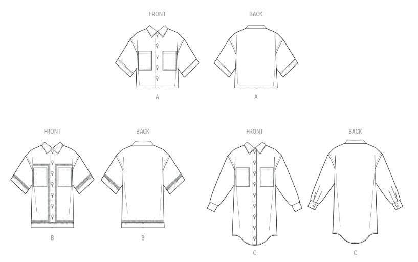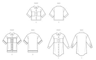 Loose fitting button front shirt patterns have collar with top stitching, dropped shoulders and chest pockets. Views A and B have short sleeves. View B has purchased trim. View C has long sleeves with button cuffs and shaped hem.