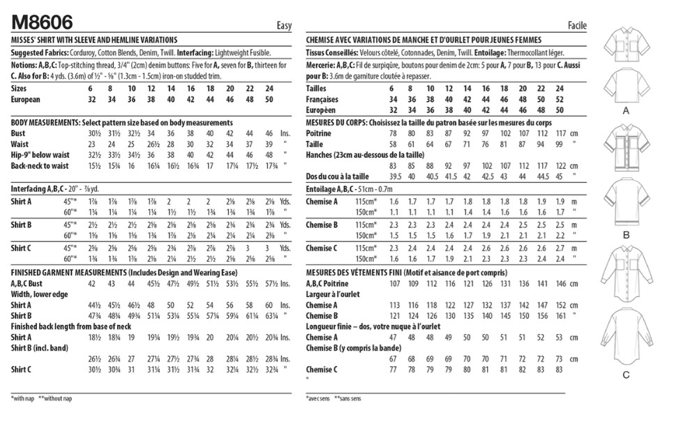 Fabric Suggestions: Corduroy, Cotton Blends, Denim, Twill. Interfacing: Lightweight Fusible.