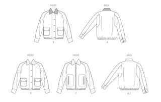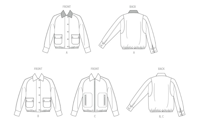 Unlined blouson jacket patterns have pointed collar, elastic hem, patch pockets and button cuffs. Views A and B have front button opening. View C has separating front zipper.