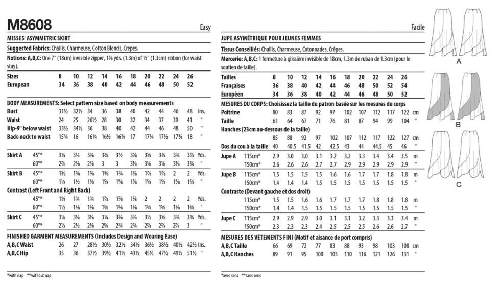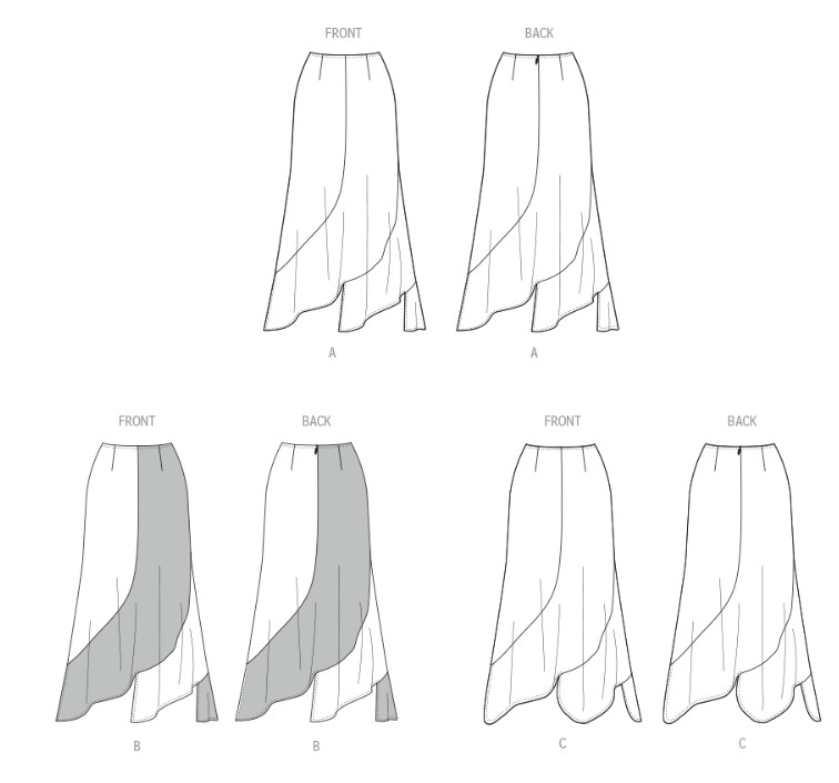 Fitted ankle length skirt sewing patterns have paneled design, handkerchief hem and invisible zipper closure. View B skirt has contrast. View C skirt has hem shape variation.