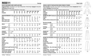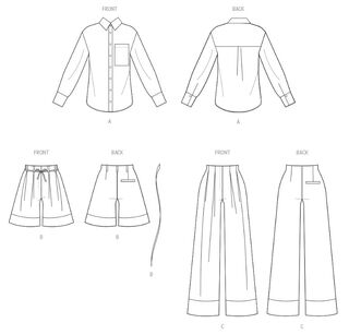 Semi-fitted shirt pattern has button front opening, collar, dropped shoulders, yoke, back pleat and chest pocket. High-rise shorts and pants have fly front zipper, back welt pocket, hem cuff. Shorts include ties.