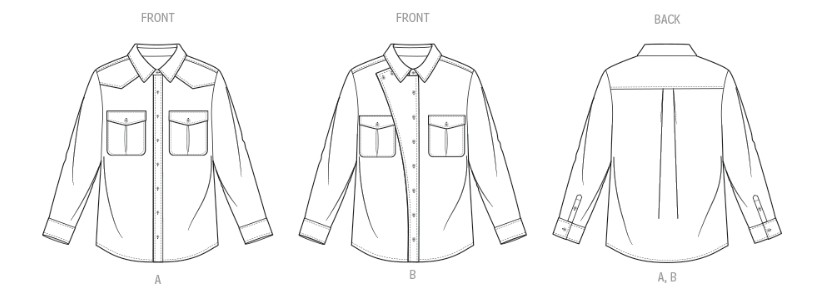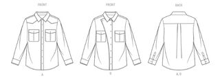 Casual button front shirt patterns have collar, collar stand, front patch pockets with button flaps, back yoke, box pleat, shaped hem and long sleeves with button cuffs. View B shirt has a shaped placket. Sew Along Tutorial available for View B only.