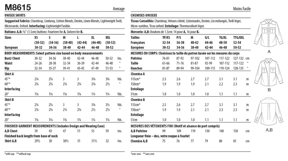Fabric Suggestions: Chambray, Corduroy, Cotton Blends, Denim, Linen Blends, Lightweight Twill, Microsuede, Oxford. Interfacing: Lightweight Fusible.