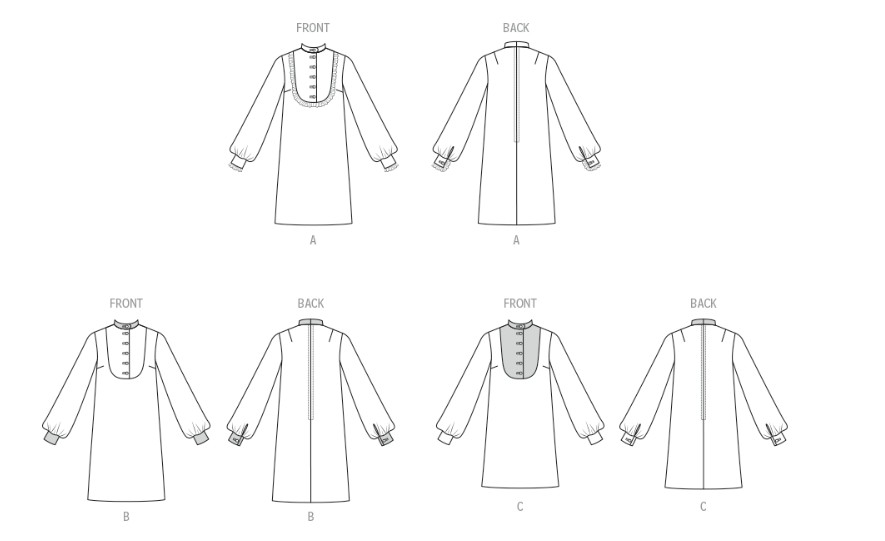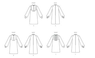 Fabric Suggestions: Crepe, Crinkle Cottons, Lengthwise Striped Fabrics, Linen, Pique, Printed Silks or Cottons, Seersucker, Synthetic Mixtures. Collar and Cuffs B: Linen, Pique. Interfacing: Lightweight Fusible or non-fusible.
