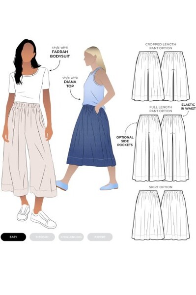 Beginner-friendly, elastic waist A-line skirt or very wide leg pant, with optional inseam pockets